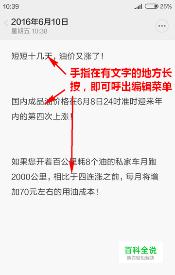 进入小米便签后,手指在便签内有文字的地方长按,即可以呼出编辑快捷菜单。注意,一定要在有文字的地方长按,在没文字的地方长按只能将光标定位到该处,或者是仅仅调出只有“粘贴”功能项的快捷菜单。