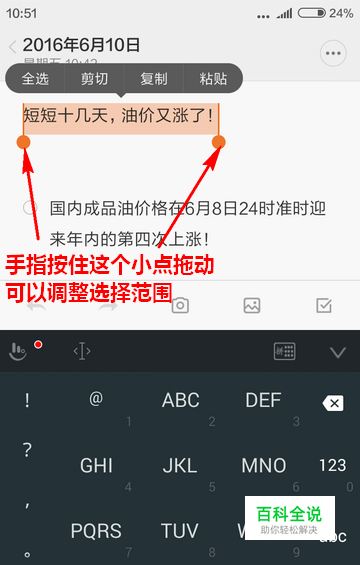 呼出编辑快捷菜单以后,将出现一个由高亮颜色标示出来的选择区域,我们可以先按住选择区域开始处或结尾光标下的小圆点不放,然后拖动它来调整选择区域的大小。 选择区域调整好之后,我们便可点击相应的菜单项来实现对应的编辑功能。