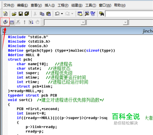 对于一个写好的C语言程序,我们首先要对它进行编译(compile),编译方法如图,点击箭头所指的按钮或者直接按快捷键Crt+7