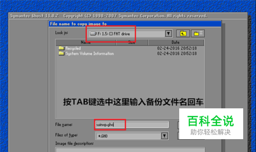 输入备份文件名 注意:保存扩展名是.GHO