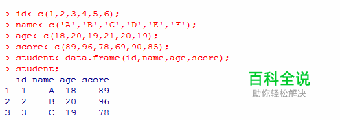 第一步,声明四个向量id、name、age和score,分别利用c()函数给这四个向量赋值;然后使用data.frame()函数生成数据帧,赋值给student并打印结果,如下图所示: