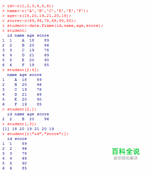 第五步,利用向量函数获取数据帧中的某个或几个的属性值,可以使用数据帧[c(属性)],如student[c("id","score")],如下图所示: