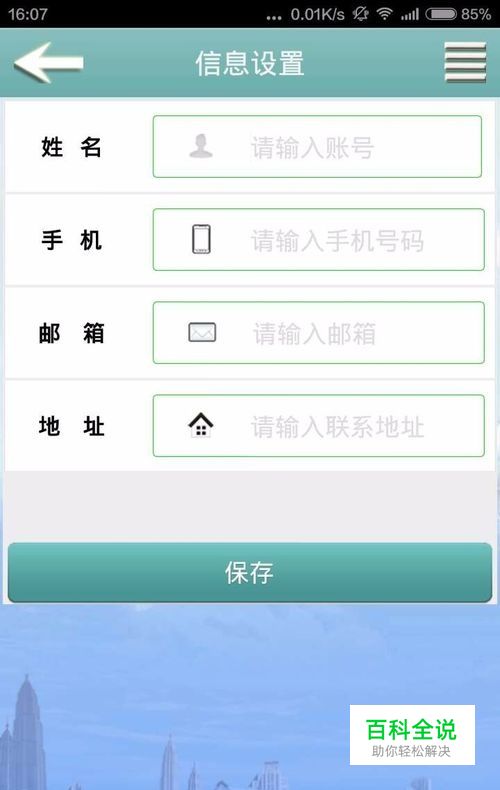 接下来,点击“信息设置”按键,进入到信息设置主界面,这个界面中,输入您的相关信息并点击“保存”,这些信息将会保存到手机本地,在发送短信的时候用来替换模板中的信息