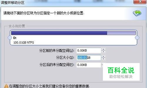 在跳出的调整/移动分区对话框中进行调整,根据实际情况调整相应的数值。然后点击确定。