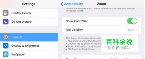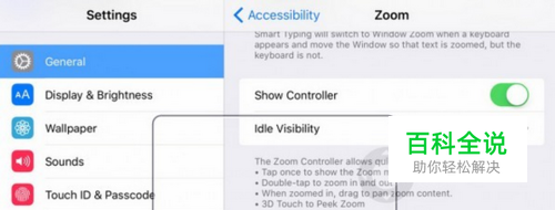 打开系统“设置”(Settings),进入“通用”(General) > 易用性(Accessibility) > 缩放(Zoom),将会看到一个“显示控制器”(Show Controller)新选项,激活该选项(默认为关闭)需要两个步骤:打开Zoom(需要三根手指同时双击来激活或禁用),然后打开显示控制器。