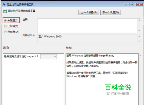 这个时候可以双击打开“阻止访问注册表编辑器”,并选择“未配置”。