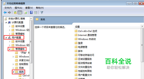 然后可以在“本地组策略编辑器”页面中,按序点开打开:“用户配置-管理模板-系统”。