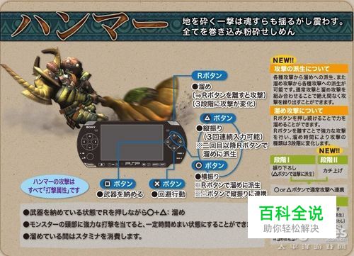操作方法: △:纵挥击 可以连续输入三次,两次以内按下R键,可以进行蓄力 〇:横挥击 R键可以进行蓄力 输入△可以进行连携攻击