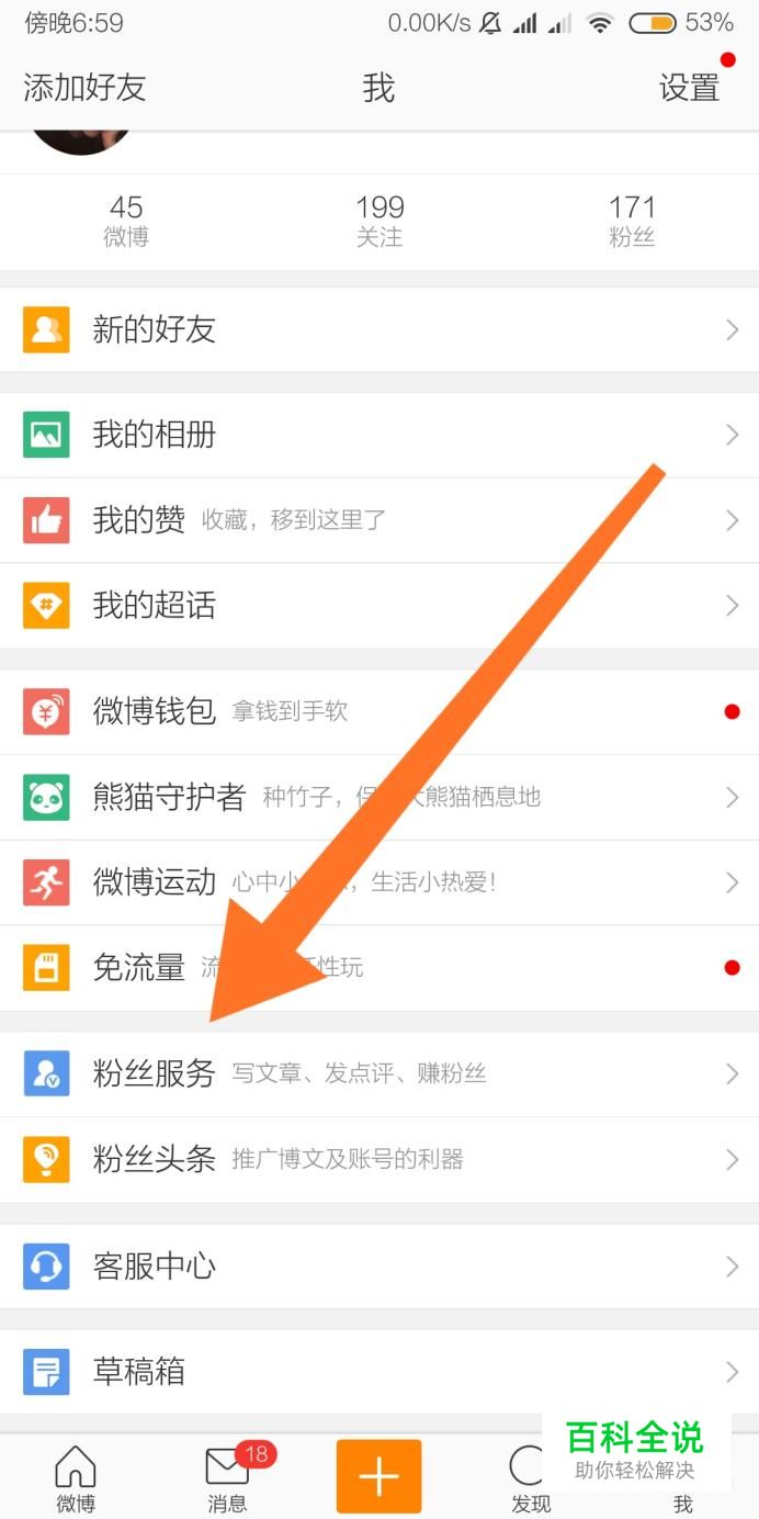 首先进入手机微博客户端“我”页面,然后点击进入“粉丝服务”。