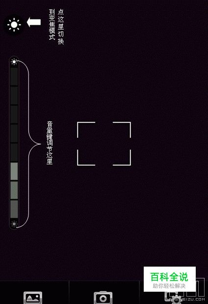 在上个屏幕状态下按音量键,屏幕左侧出现曝光度控制;如下图:此时,可用通过音量+和音量-进行曝光度调节,越向上曝光度越高,同等情况下照片越亮,一般建议使用默认值;