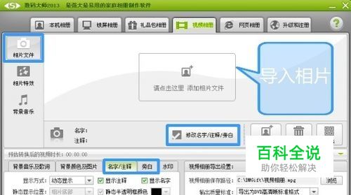 导入相片素材 第一步当然是导入相片。如图所示,数码大师的相册种类非常多,包括:本机相册、礼品包相册、视频相册、网页相册、锁屏相册等五大种类。点击顶部的“视频相册”,切换到它的功能选项卡。点击“相片文件”,在相片列表处,即可导入大量的照片素材。 点击“修改名字/注释/旁白”按钮,即可为照片加上详细的文字说明。在面板左下角的“名字/注释”和“旁白”处,设置文字说明的属性。