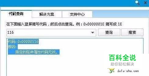 使用蓝屏查询工具,输入116代码可以看到故障的原因,代码0x00000116原因为指定的延伸属性代码无效,如图所示: