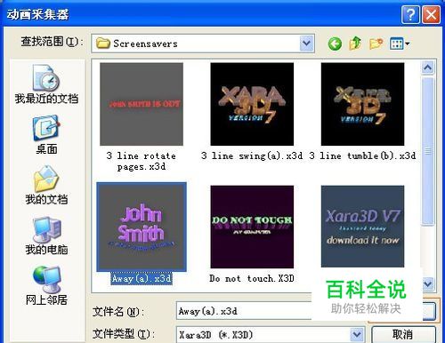 打开动画采集器,这里有很多种动画模板,一个一个的点击预览一下,选择钟意的一个。我这里随意选了一个Away(a).x3d的,“打开”。