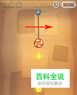 CuttheRope怪物吃糖果第三关攻略 怪物吃糖果的第三关,还是先割断红色箭头那根绳子,等糖果荡到第一颗星星(红色剪刀)位置的时候,迅速割断上面那根绳子就完成啦!轻松三颗星!