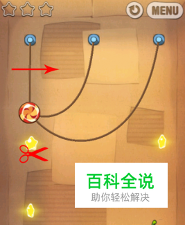 CuttheRope怪物吃糖果第二关攻略 怪物吃糖果的第二关,先割断红色箭头那根绳子,待糖果检完两颗星星荡回到剪刀位置时割断中间那根绳子就OK啦!轻松三颗星!