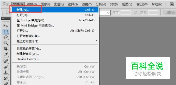 首先我们打开photoshop软件,点击左上角的文件菜单,然后选择下拉菜单中的新建选项,如下图所示