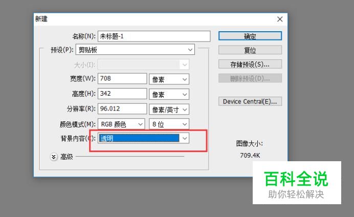 接下来在弹出的新建界面中我们将背景内容选择为透明,如下图所示