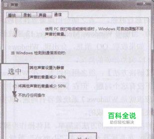 在弹出的“声音”对话框中切换至“通信” 选项卡,系统默认选中“将其他声音的音量减少80%”单选按钮,将默认修改为选中“不执行任何操作”单选按钮,如图2所示,设置完毕后,单击“确定”按钮退出即可解决问题