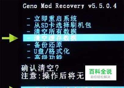 返回到recovery主界面,然后用音量键选择【清空缓存数据】,然后再选择【是的-清空所有缓存】然后按电源键确认