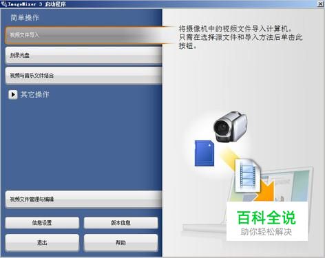 软件安装后主界面 随机附赠的视频编辑软件一般有两个最大的好处,第一个是免费,第二个是兼容性好。一般情况下我们采用第三方视频处理软件都会遇到购买版权和与原始视频不兼容等诸多问题,这些在随机附赠的软件中迎刃而解。此外还可以有效的备份摄像机中的视频拍摄文件,以防误删带来损失。