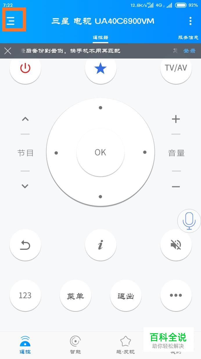 首先在应用市场下载一个“遥控精灵”安装好并打开,在首页中点击左上角的三根杠标志。