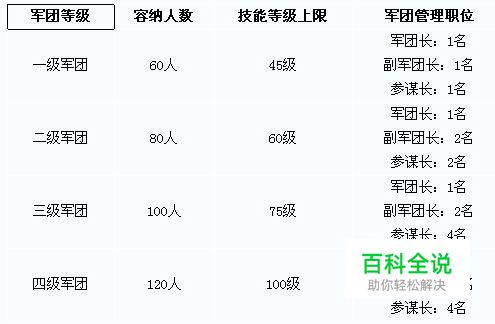 军团一共划分为四个等级。目前最高等级的四级军团容纳人数为120人。军团有级别限制,军团的人口上限随军团等级提高而上升。只有达到相应的军团建设度和军团资金的标准以后,才可以提升军团的等级。