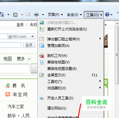 首先打开ie浏览器,点击工具栏上的工具按钮,然后点击internet选项。也可以在别的浏览器中打开网络连接选项,只需要切换到IE内核即可。