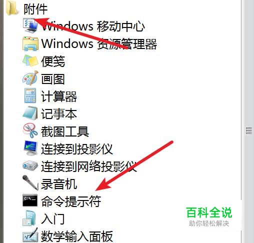在所有程序里找到‘附件’,并打开里面的‘命令提示符’