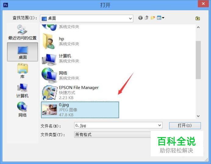打开ps这款软件,然后按下Ctrl+O键在弹出对话框内找到我们的图片素材,如图所示: