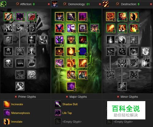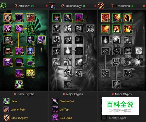 注释 •带魅魔输出。 •如果你有很高的急速(1400 +),把生命分流雕文换下来吧 •如果你打算用生命吸取取代暗影箭作为填充技能,你也可以把生命分流雕文换下来 •有些天赋点是可选的,可以按自己的兴趣自己安排加点。 •如果你使用吸取生命做输出技能,专精等级的价值会增加。
