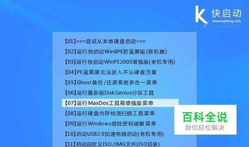 首先把制作好的u盘启动盘连接至电脑usb接口,然后重启电脑,当屏幕出现开机画面的时候按下启动快捷键,系统便会进入到启动项选择窗口,我们选择u盘启动后,系统会进入快启动主菜单,通过键盘的上下键选择【07】运行MaxDos工具箱增强版菜单,按下回车键确认,如下图所示:
