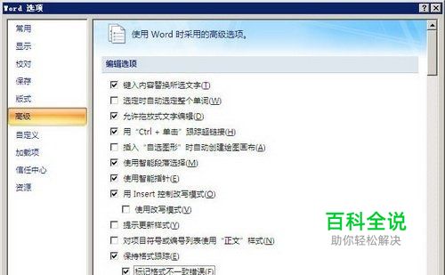 第2步,打开“Word选项”对话框,切换到“高级”选项卡。在“编辑选项”区域选中“保持格式跟踪”复选框,并同时选中“标记格式不一致错误”复选框即可,如图2012040317所示。 图2012040317 选中“标记格式不一致错误”复选框
