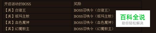 野外BOSS伤害TOP10 龙纹战域大陆又掀起了击杀BOSS的浪潮。现在击杀野外BOSS不仅可以掉落极品装备、挖掘八大神戒,每次伤害排行前10的玩家还会获得特殊奖励——BOSS召唤令,让您BOSS杀个够,装备爆个爽! 活动开启BOSS 活动规则 当玩家进入开启活动BOSS对应的地图,并且对【真】BOSS造成伤害,游戏窗口左侧会出现“伤害排行”面板。面板只显示伤害前10的玩家,若有多个玩家伤害相同,则先达到此伤害数值者居上。 玩家对BOSS造成的伤害不会因为离线或者离开BOSS房间而被清除。 BOSS被击杀后,根据伤害排行,排行前10的玩家都会收到奖励邮件。 一、 BOSS召唤令 【真】BOSS被击杀后,伤害排行前10的玩家都会得到1个对应的BOSS召唤令(绑定)。集齐10个相同的BOSS召唤令,可在对应BOSS地图召唤对应BOSS。例如:10个BOSS召唤令(血色魔神)可在魔神巢穴召唤一个【召唤】血色魔神。 注:当BOSS房间有【召唤】BOSS存在时,其他玩家无法再使用BOSS召唤令。 二、 召唤BOSS与击杀奖励 召唤出的BOSS与真BOSS有相同的属性和能力,千万不要大意!召唤的BOSS被击杀后,金币、装备等道具直接给该玩家发送奖励邮件.