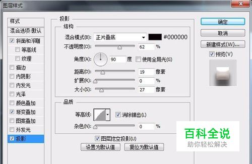 复制一层“按纽”图层,更改图层名为“投影”,将图层填充设置为0,再添加一个图层样式,我们来增强下投影效果