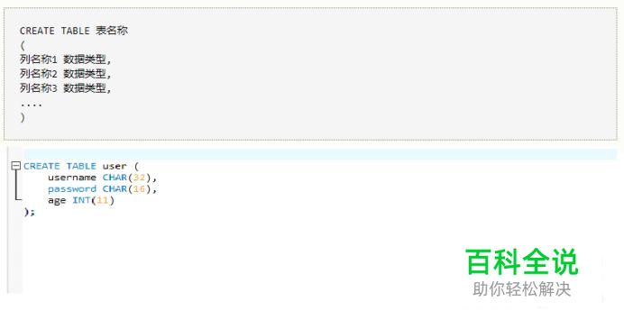 首先我们看看创建表的语句。这里我们以创建名为user的表,表头如下: username password age sex 创建表的语句格式以及本例的具体语句如下: