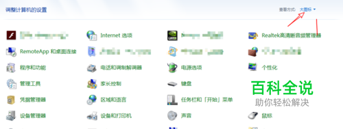 第一步先点击控制面板内的右上角的查看方式,选择大图标,接着选择图中红色数字2这里,选择显示图标。