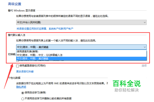 打开控制面板选择语言,点击右侧高级设置,单击替代默认输入法 选择中文简体美式键盘。即可!