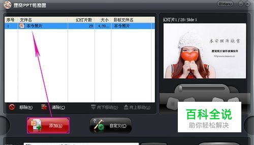 切换特效制作完成之后,在菜单栏的幻灯片放映选项可以播放幻灯片,若觉得效果满意,点击保存PPT相册,初步的相册就成型了。下面就使用狸 窝照片制作成视频软件,把PPT相册转换为电子相册。 打开狸 窝照片制作视频软件,通过“添加(A)”按钮,把PPT相册导入到软件中。