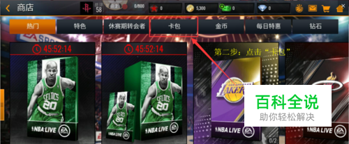 NBALive好球员获得途径一(第二步):进入游戏商城以后,点击菜单栏中的“卡包”。