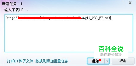 请出迅雷,新建任务,将上一步获取到的地址复制进去,点击继续,等待下载完成 。 下载完成后我们可以看到,该flash文件(.swf)已经成功保存在了我的桌面上!