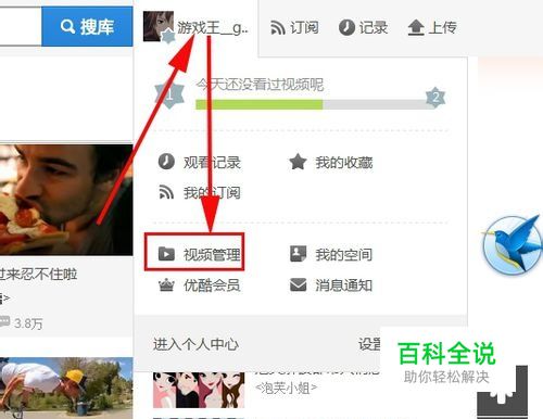 登陆优酷账号,把鼠标移到自己的账户名字上,选择账户下面的“视频管理”