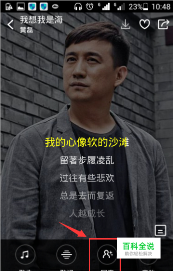这时,歌曲播放页面已经出现了这名歌手的写真图片,这是,需要点击手机的菜单项,如图所示。