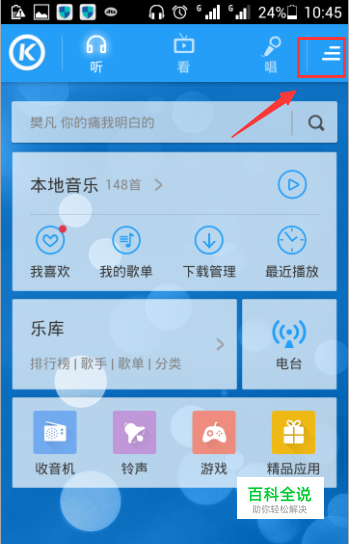 进入到酷狗音乐的主页面以后,我们要点击右上角的三条横线的图标,如图所示。