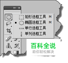 打开PHOTOSHOP,在工具箱点击“选框工具并按住左键不放,就会出现选框工具的所有的子工具。