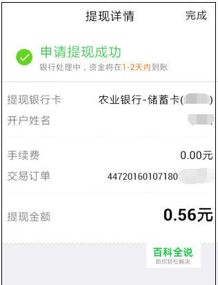 输入密码后,出现申请提现成功的详情,告诉你银行处理中,资金将在1—2天到账,点击右上角的“完成”即可。