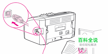 用 USB 线缆连接惠普 LaserJet 1020 打印机和个人计算机。线缆两端的接头一扁一方,扁的一头连个人计算机,方的一头连打印机。 小提示:打印机的电源开关位于背面,先不用打开。