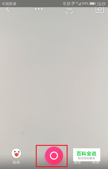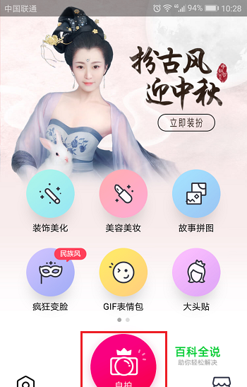 第一步在我们的手机里面打开软件进去主界面,点击中间的自拍按钮,如下图所示: