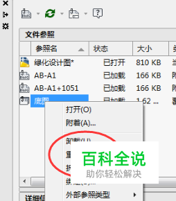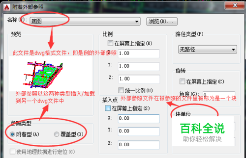 下面简单介绍下CAD文件及其参照文件的关系,见图... ”底图“即为外部参照文件,这个文件在参照时有路径3种路径类型,在此不做介绍。因有路径的类型,因此文件与外部参照文件就像人与其影子,是需要如影随形的,若两种文件分开了(电脑中的一个文件夹路径下),即不在同一个文件夹路径了,那么外部参照就会出现不显示,需要手动选择路径重新加载,或者将外部参照文件拆离后重新加载等情况。另外图中有个块的单位选项,进行参照时,一定要注意文件和外部参照文件的绘图比例,参照时的 块单位也需要与文件图纸的绘图比例一致,否则将导致外部参照文件的尺寸在文件里不能对应。