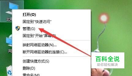 在Windows10桌面,右键点击“我的电脑”图标,然后在弹出的菜单中选择“管理”菜单项