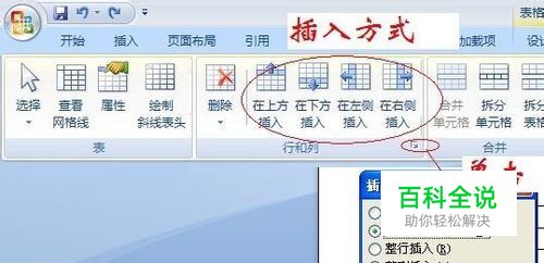 选中单元格,找到【布局】选项卡下的【行和列】组中选择插入方式,如图: